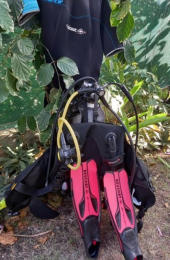 Nous disposons de 4 équipements complets de plongée dont un équipement pour enfant à partir de 8 ans. Shortys, palmes, masques, tubas toutes tailles 3 bouteilles de plongée 12L1 bouteille 15l 1 bouteille 9l1 compresseur Nardi 6m3